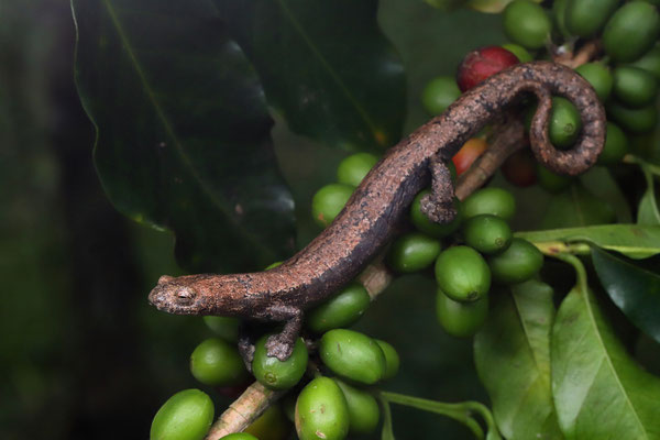 In between our separate stays in the San Vito area, Laura and I explored the uplands around Sabalito. We had a nice big house all to ourselves, but we sorely missed our herping buddies Jesse and Finn. And glass in front of the windows. Windows that we could close would have been nice to have in a house in a rainy country in the rainy season. But as usual, we didn't spend a lot of time in the house anyway... We spent a lot of time in the Las Tablas area. We were happy to learn the road had improved a little bit more since our last visit. But only a little bit, we still drove that horrible road 6 times during our stay. Back in 2021 we weren't very successful and we had high hopes that this time we would find the enigmatic Bolitoglossa sombra. We had quite some rain during the day and indeed the forest was teeming with life. In a stream we found several calling Mountain Stream Tree Frogs (Isthmohyla rivularis) while Moustache Bromeliad Tree Frogs (Isthmohyla picadoi) were calling high overhead from bromeliads. I even found a little freshly metamorphed individual inside a low-hanging bromeliad. In the vegetation we found several Cerro Pando Highland Anoles (Anolis kemptoni), while numerous Talamanca Earth Snakes (Geophis talamancae) and Checkered Coffee Snakes (Ninia psephota) were crawling around. I even spotted a Black-speckled Palm Pitviper (Bothriechis nigroviridis) laying in ambush next to the path which is always a highlight! Sadly of salamanders not a sign though! Just when we were about to leave, Laura spotted a little head sticking out from some moss on a tree. Not the species we were hoping for, but Brame's Webfoot Salamander (Bolitoglossa bramei) is also a rarely seen species. We returned a second night, but mostly found the same species. No sign of that sombra and we have to return again to see that one. We also met local herper Edwin who showed us his coffee plantation. Here we were successful with the salamanders and in the pouring rain Edwin and Laura found two big and beautiful individuals of Wood-coloured Webfoot Salamander (Bolitoglossa lignicolor).