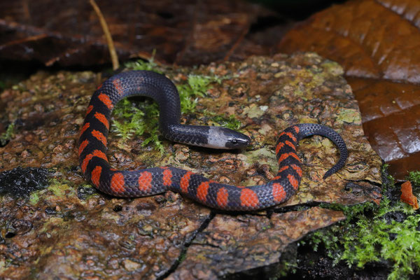 The lowlands were incredibly hot and humid, but also very dry and especially during the end of our stay we didn't have any rains anymore. We decided to escape the heat and drive into the mountains. After all, there are also records of B. alvaradoi higher up, so we tried our luck there. At first we spotted very nice vertical mossy banks of road cuts. Perfect habitat for salamanders, so we carefully started peeling away moss next to a busy road in the pouring rain. That is the true holiday feeling! Not for long until Laura found one of the smallest salamanders of Costa Rica, a Cordillera Central Moss Salamander (Nototriton abscondens) while I found a Taylor's Large-scaled Lizard (Alopoglossus plicatus) hiding out in the same microhabitat. Further up the mountains we searched both during day and night. Along a streambed we spotted various Banded Giant Canopy Anoles (Anolis microtus). The juveniles were lower down, but to photograph an adult male I had to climb a bit... On the road I spotted a Bicoloured Coralsnake (Micrurus multifasciatus). There was heavy traffic, but luckily passing cars missed the snake and we managed to save it from a certain death. A coralsnake mimic was seen during the day as we encountered a Tropical Black Milksnake (Lampropeltis micropholis) on the crawl in the cloud forest. It was great to explore this habitat and to escape the heat of the lowlands a bit.