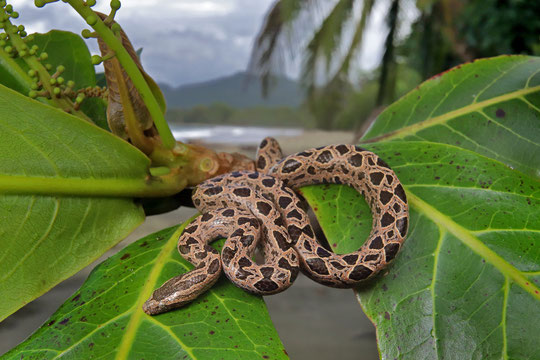During our last visit to Costa Rica we got stuck in Cahuita as the Penshurt bridge collapsed. Back then we didn't have the best impression of the coastal town, but this time it sure made up for it! We happened to be visiting during the Afro Roots and Culture Festival and the town was alive and buzzing with parades and festivities. We didn't get to see much of that, because luckily the nearby forests were also buzzing with activity. During our first night we did a small stroll close to the Cahuita National Park. We quickly saw our first "Oropel", the stunning yellow Eyelash Palm Pitviper (Bothriechis nigroadspersus) and a few more common species. In an abandoned building we saw four species of gecko and we suspected that our main target for the area might be around. Then Laura saw a tiny snake head sticking our from under the partially collapsed roof. It was a Southern Bromeliad Boa (Ungaliophis panamensis)! We tried to catch it using a long stick, but the snake retreated into the roof. It was quite high up so we ran towards the nearest house and asked them for a ladder. A completely normal question from two overexcited people on rubber boots in the middle of the night... But the people of Cahuita were again super accommodating and before we knew it, I was standing on a ladder, peering into the roof system which was riddled with bat poop and spiderwebs. No sign of the snake though and we were very sad about that. We had a late dinner and both realised this was such a unique opportunity as we knew the snake could not have gone far. We tried it again (without ladder once more) and again Laura spotted the snake hanging from the roof. This time a bit lower and with Laura on my shoulders we managed to catch it and admire it up close. What a gorgeous snake and this species was well worth the wait as we had tried to find it on many previous trips. Also during daytime we didn't sit still and the national park was a surprisingly nice place to explore. Despite the amount of people we saw many more Oropel, observed foraging Raccoons (Procyon lotor) and were harrassed by White-faced Capuchins (Cebus imitator). Just behind the beach we could even make some in-situ pictures of a snake we had seen several times, but could never photograph: a Speckled Racer (Drymobius margaritiferus).