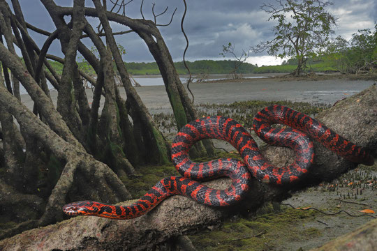 After a long drive we arrived in Dos Brazos where the climate was even a bit more brutal than La Gamba. We first explored several mangroves at the coast to scout potential habitat for our main target. After a nice sushi dinner we headed back to see if we could find it. In the hot and humid mangroves we did encounter common species such as Ctenosaura similis, Basiliscus basiliscus, Leptodactylus insularum and Leptodactylus savagei, but our main target took a while to find. Just before giving up, Laura found a little trail going towards a slightly different microhabitat and we decided to check that out before going to bed. There a red and black snake suddenly appeared and I spotted the most beautiful Mangrove Cat-eyed Snake (Leptodeira rubricata) crawling around on the mudflats. Naturally we were beyond happy to not only see our target species, but also such an incredible individual at that!